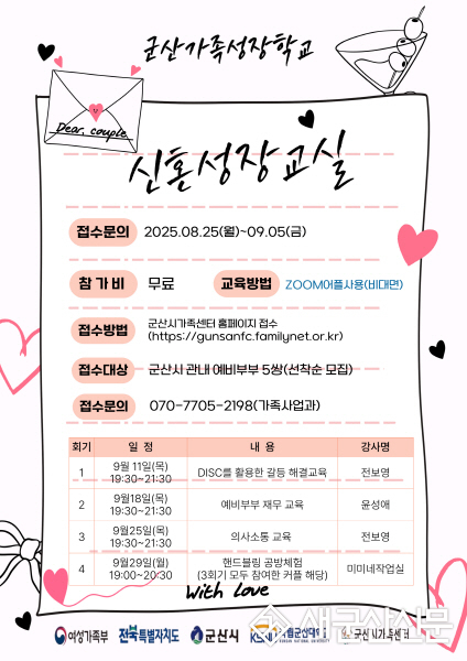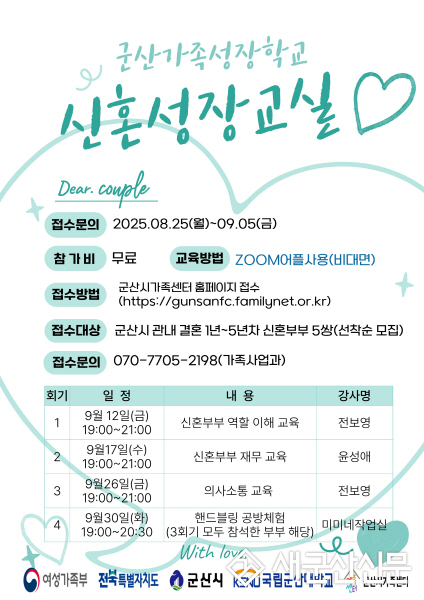 국립군산대학교 산학협력단에서 수탁 운영하는 군산시가족센터는 오는 9월, 예비부부와 신혼부부를 대상으로 하는 온라인 교육 프로그램 ‘신혼성장교실’을 새롭게 개강한다.