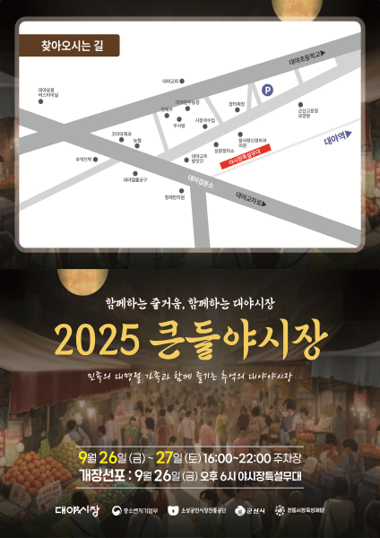 한편, 대야전통시장상인회는 행사 기간 방문객들의 안전을 위해, 자동심장충격기(AED) 비치·부스별 소화기 구비·우천 시 대비 비가림막 설치·안전요원 배치 등 시민과 관광객이 안심하고 축제를 즐길 수 있도록 만전을 기할 계획이다.