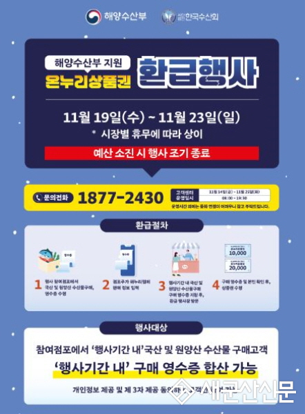 특히 김장철에는 젓갈류, 생선류 등 수산물 소비가 크게 늘어 가격 부담이 가중되는 시기인 만큼, 이번 환급행사가 시민들의 겨울철 식탁 준비에 실질적인 도움이 될 전망이다.